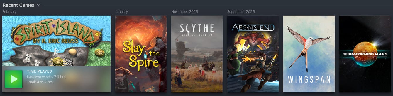 Forty-three hours. Oof. To be fair, “online entertainment” was my catch-all bucket, and I’m probably under-reporting some other categories. For example, the Family bucket only counts one-on-one time. Still, this was the big surprise of this time audit. I don’t watch much TV, don’t get too caught up in doomscrolling…but lately I have been playing the digital version of Spirit Island. A lot. I worked out that I spent 408 hours playing Spirit Island from 5 June 2025 to 6 January 2026. About 13 hours a week on average, or roughly 2 hours a day.