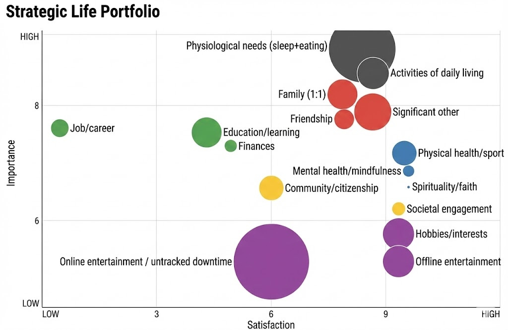 Protect what’s already working. Life is pretty great across Significant other, Family, Friends, Physical health, Hobbies and Offline entertainment. All high importance, high satisfaction.